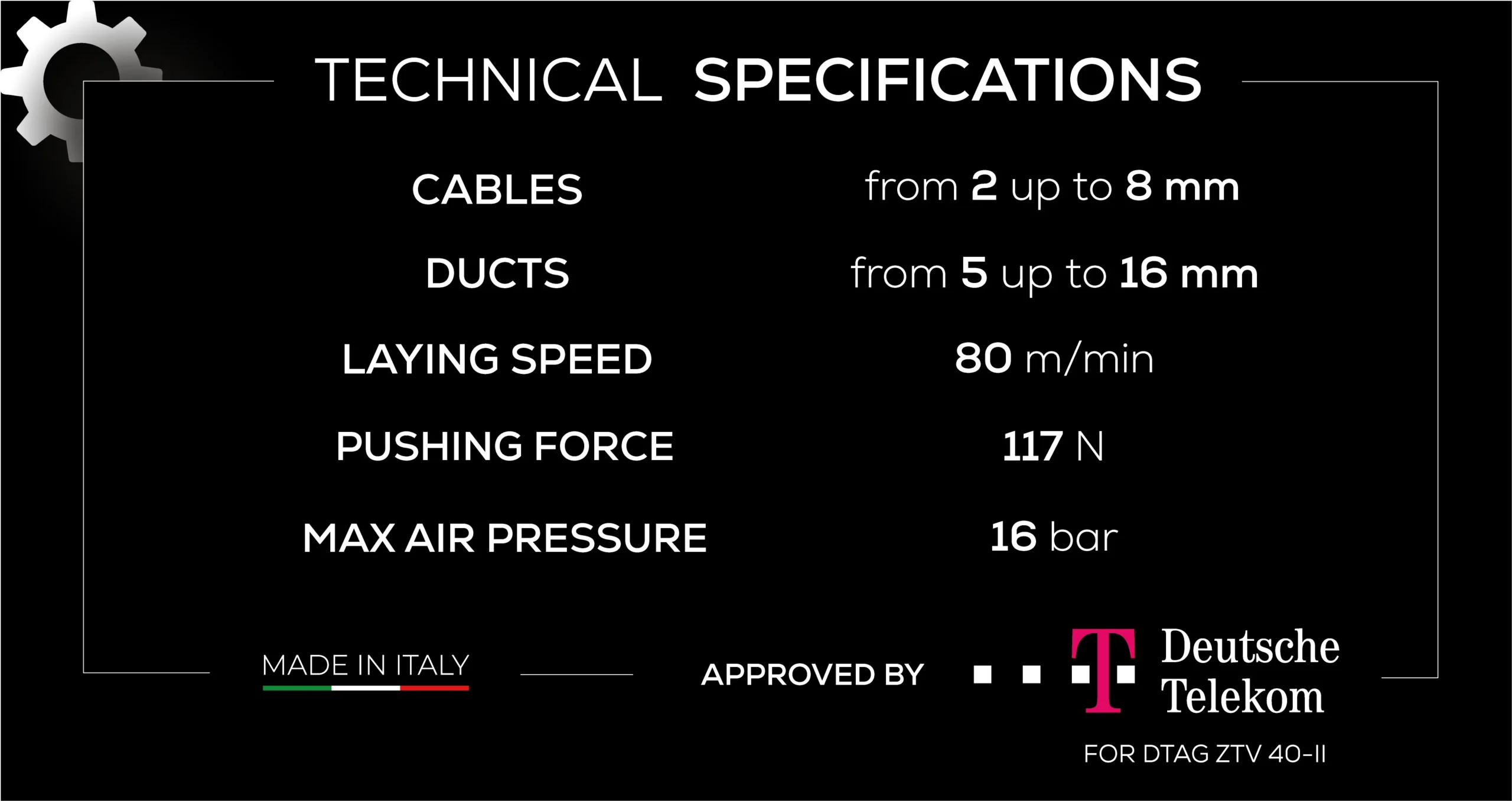 When used with the dedicated electric motor, Lady features advanced electronic control. The operator can set the pushing force independently from the speed, while the system automatically reduces speed when resistance increases, protecting the cable. Powered by 3 × 18V 5Ah Milwaukee batteries, it provides up to 5 km of installation per charge.