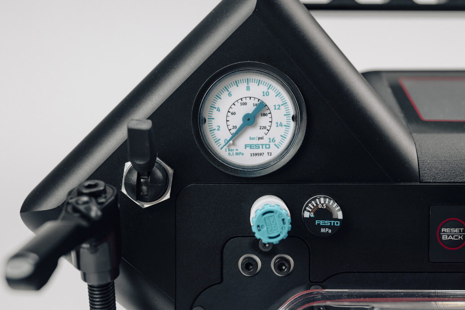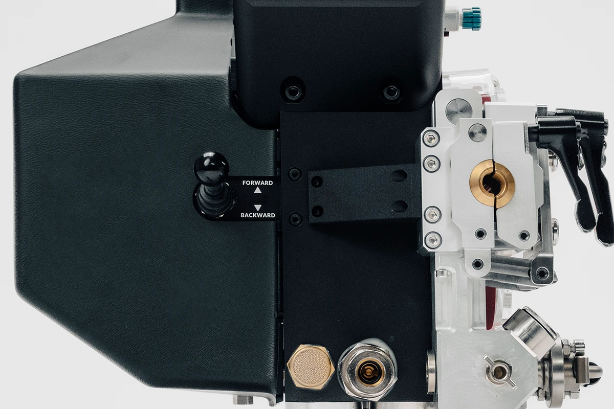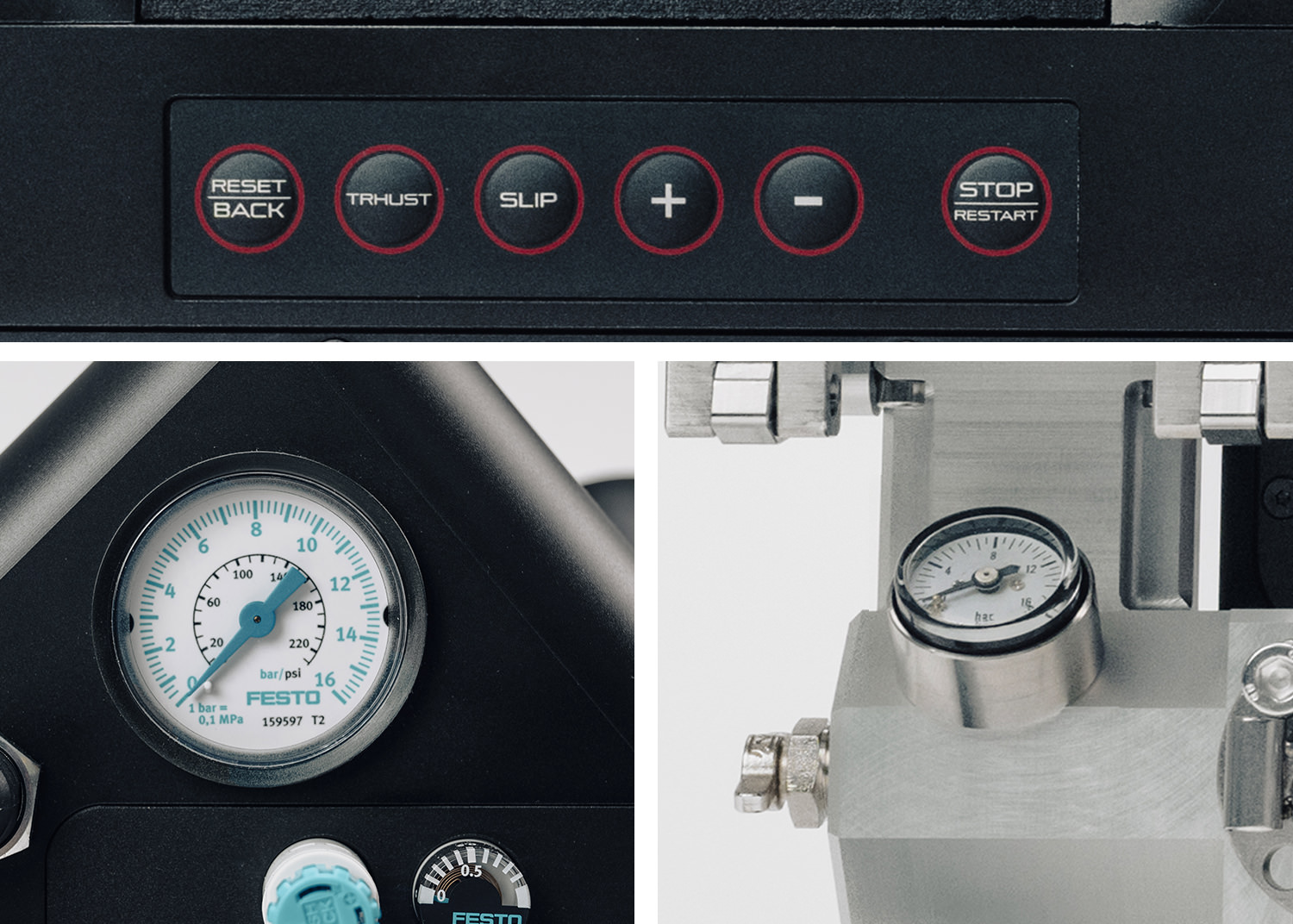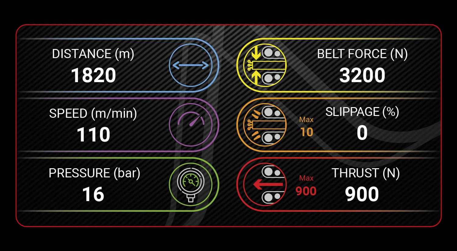 The belt clamping force is pneumatically controlled and manually adjustable, with the value displayed on the screen. This allows operators to monitor the pressure applied to the cable and easily replicate the same settings in future installations.